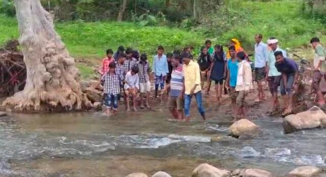 पुल नहीं होने से उफनती नदी को पार कर बच्चे जाते हैं स्कूल ,
