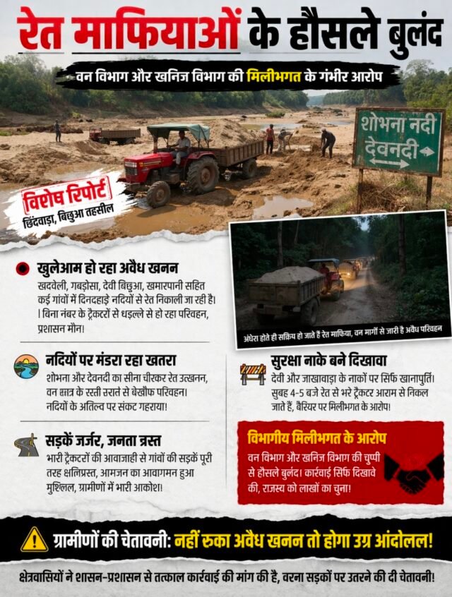 क्षेत्र के खदवेली, गबड़ोसा, देवी बिछुआ और खमारपानी सहित कई गांवों में रेत माफिया सक्रिय हैं। दिनदहाड़े नदियों से रेत निकाली जा रही है और रात होते ही ट्रैक्टरों के जरिए बड़े पैमाने पर परिवहन किया जा रहा है। बिना नंबर प्लेट के दर्जनों ट्रैक्टर रोजाना सड़कों पर दौड़ रहे हैं, जिससे शासन को लाखों रुपये के राजस्व का नुकसान हो रहा है।