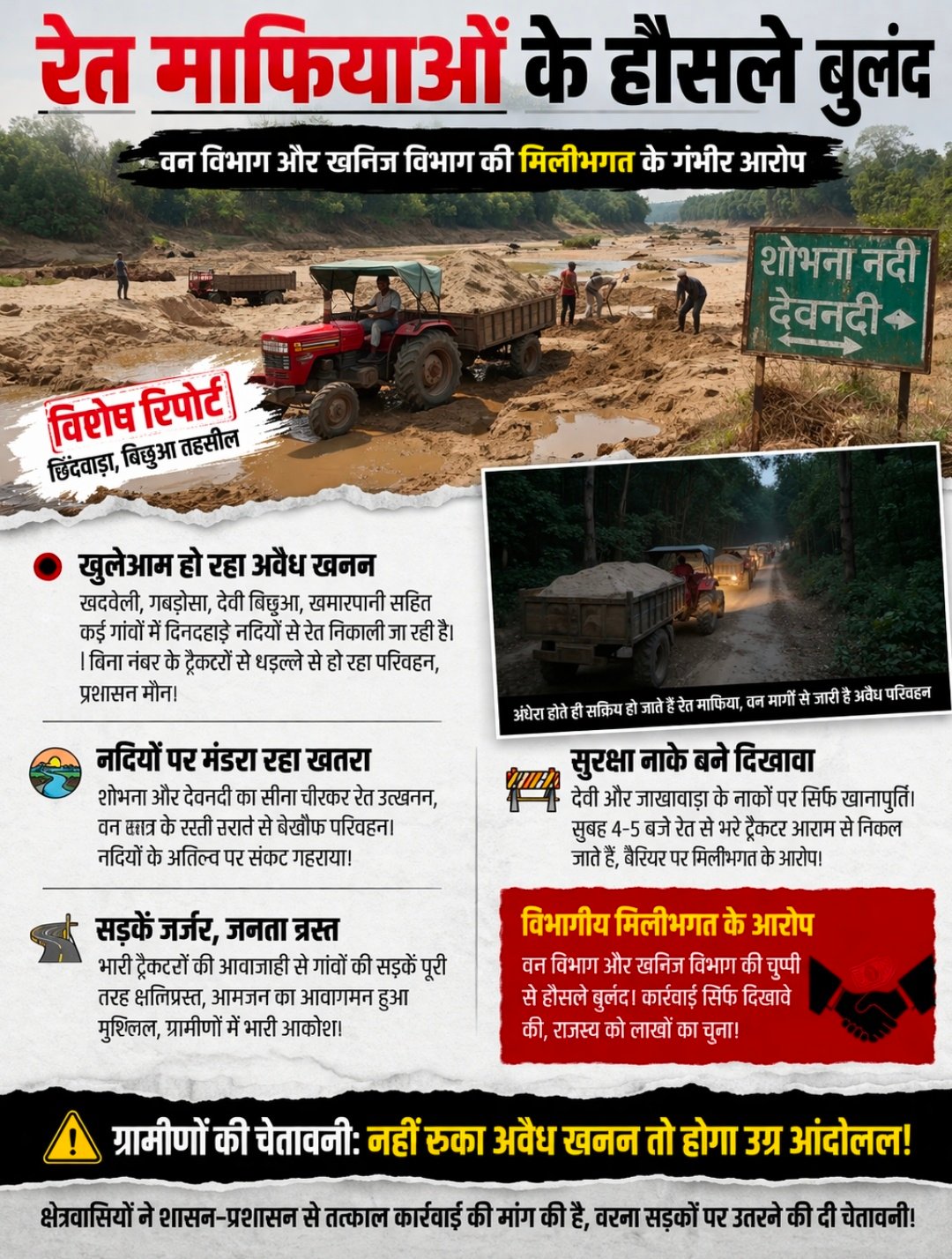 क्षेत्रवासियों ने शासन-प्रशासन को चेतावनी दी है कि यदि जल्द ही रेत माफियाओं पर सख्त कार्रवाई नहीं की गई, तो वे सड़कों पर उतरकर उग्र आंदोलन करेंगे।