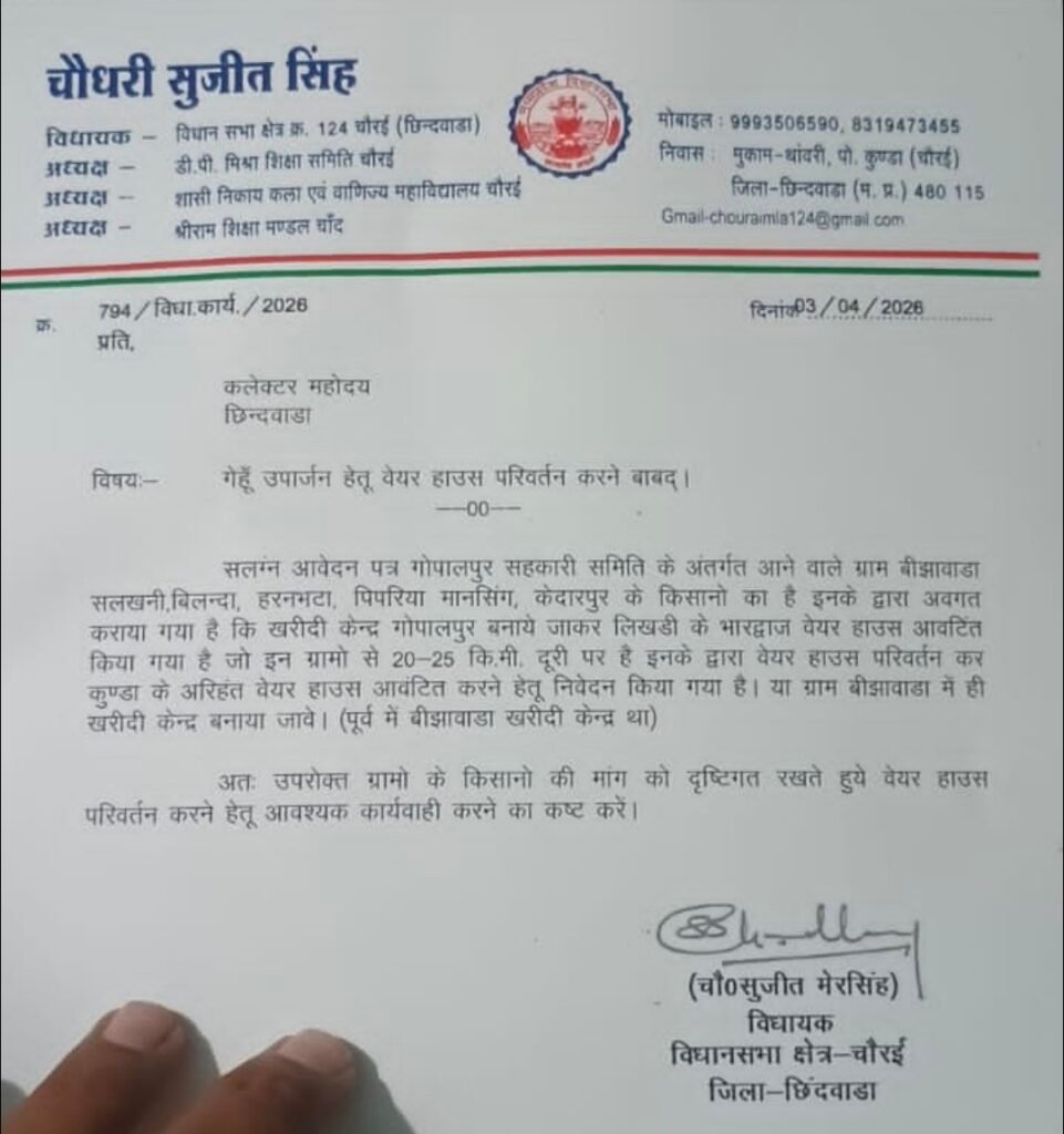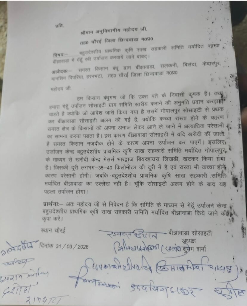 छिंदवाड़ा (बींझावाडा)चौरई विकासखण्ड के बहुउद्देश्यीय प्राथमिक कृषि साख सहकारी समिति मर्यादित बींझावाड़ा को अलग सोसाइटी का दर्जा मिलने के बावजूद गेहूं उपार्जन केंद्र का संचालन न किए जाने से क्षेत्र के किसानों में भारी आक्रोश व्याप्त है। किसानों ने इसे विभागीय लापरवाही और मनमानी करार दिया है।