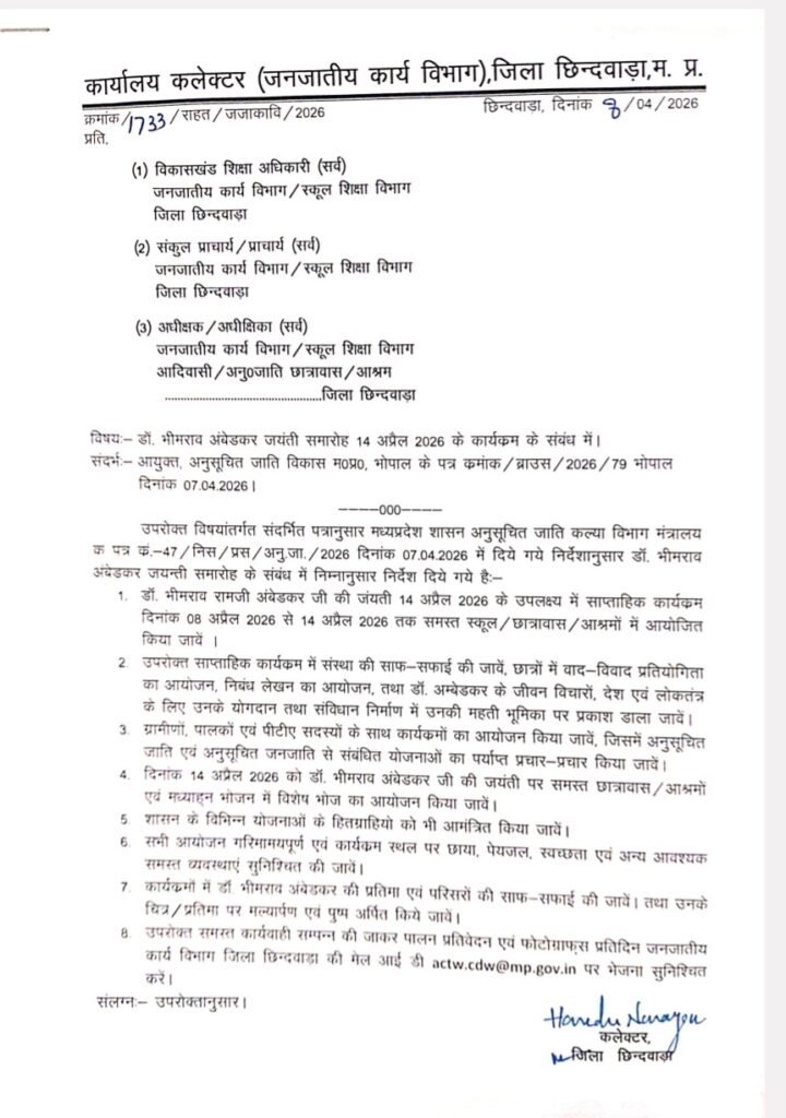छिंदवाड़ा(पंचायत दिशा समाचार) जिले के समस्त स्कूलों, छात्रावासों और आश्रम शालाओं में इस वर्ष डॉ. भीमराव रामजी अंबेडकर की जयंती बड़े ही उत्साह और गरिमामय वातावरण में मनाई जाएगी। कलेक्टर द्वारा जारी आदेश के अनुसार 8 अप्रैल से 14 अप्रैल 2026 तक सप्ताहभर विभिन्न शैक्षणिक, सांस्कृतिक और जागरूकता कार्यक्रम आयोजित किए जाएंगे।